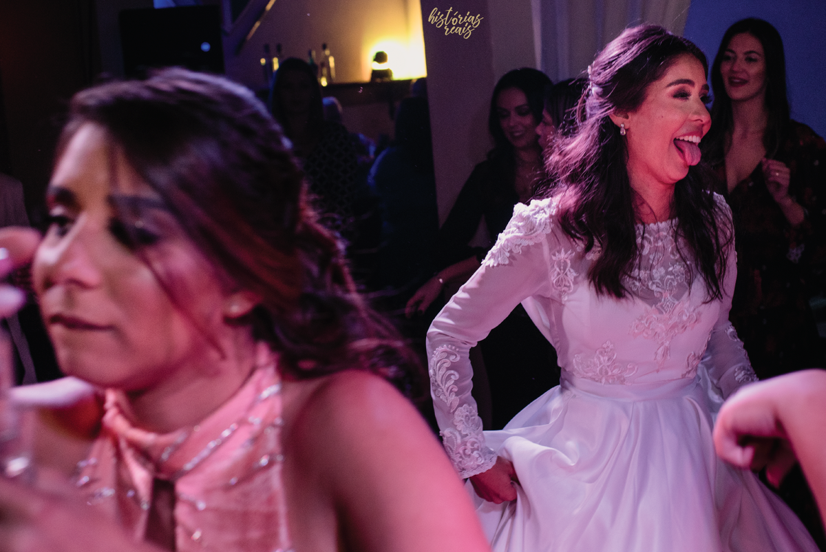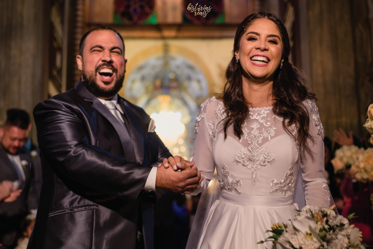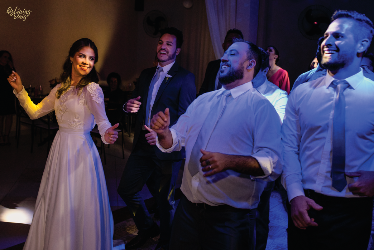 Que tal uma noiva estilista que projetou seu vestido com uma calda de 5 metros? Agora um noivo alto astral que não deixa nada pra depois. Isso somado a um galera insana que quando junta vira festa, daquelas sem hora pra acabar!